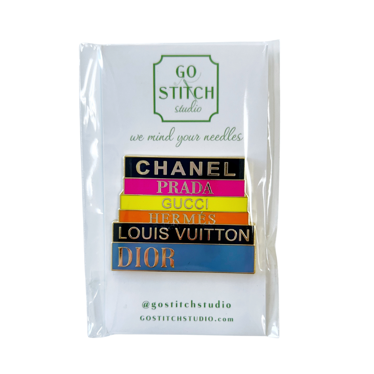 Hard enamel stack of designer coffee table books with silver metal lettering. This is the biggest needle minder in the collection. Recommended for large canvases.